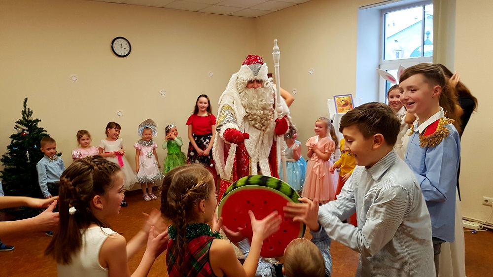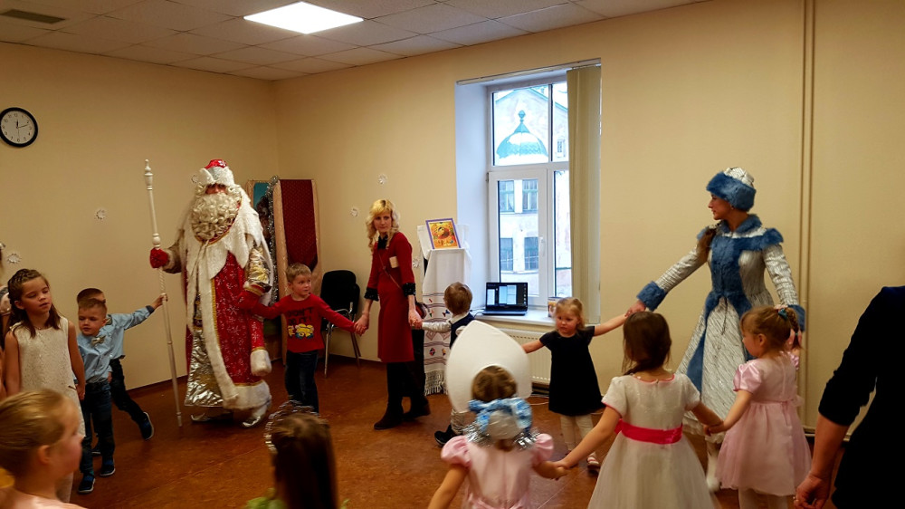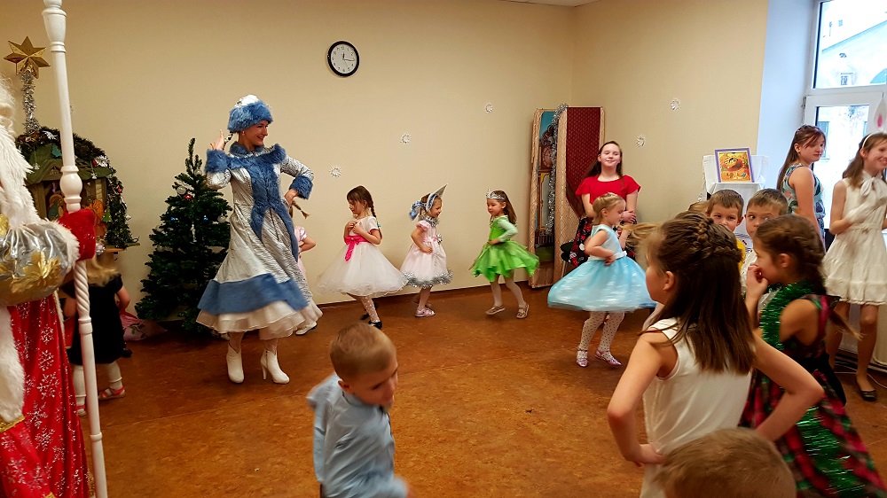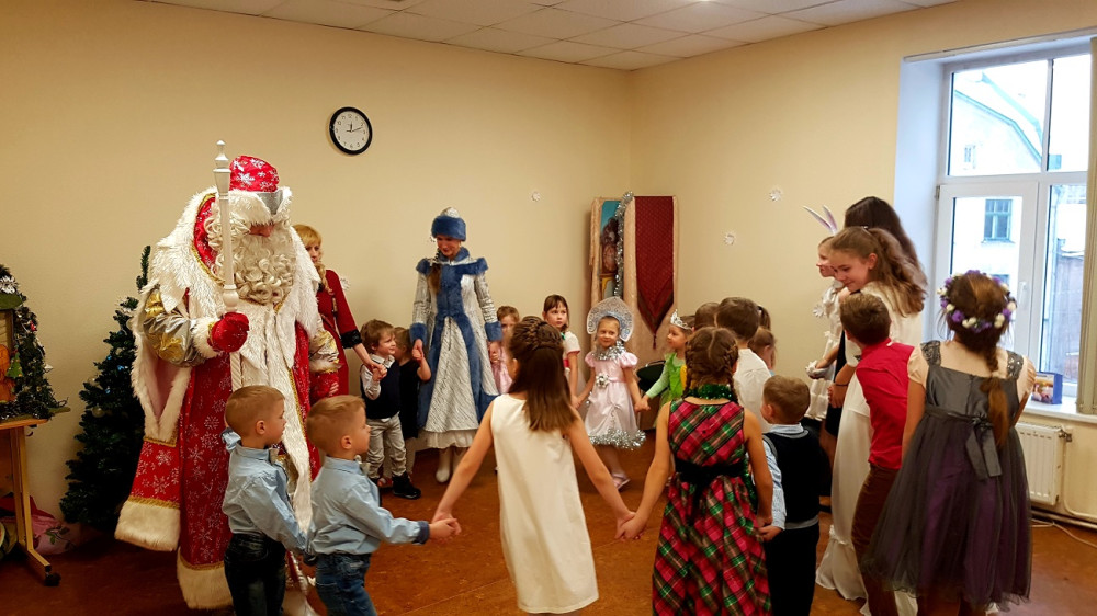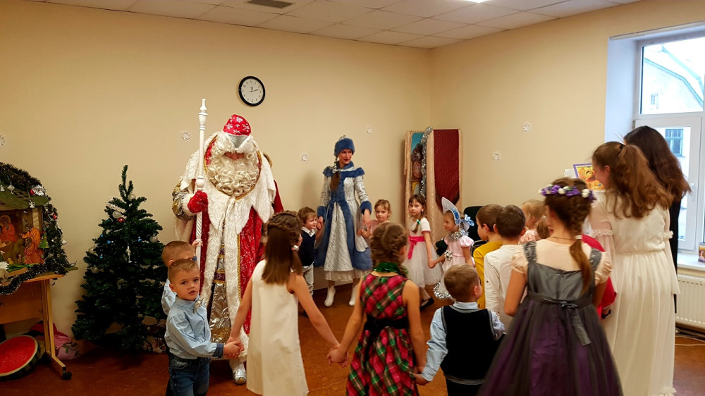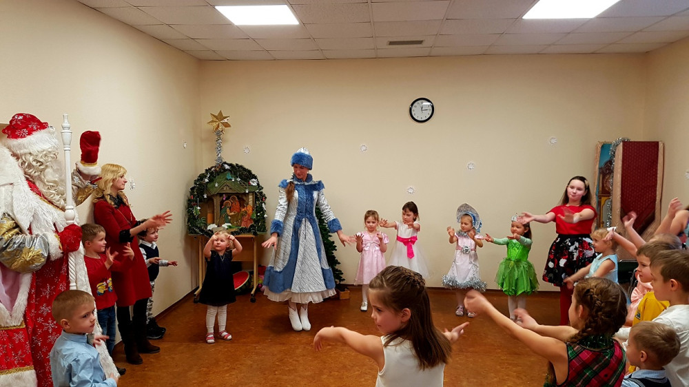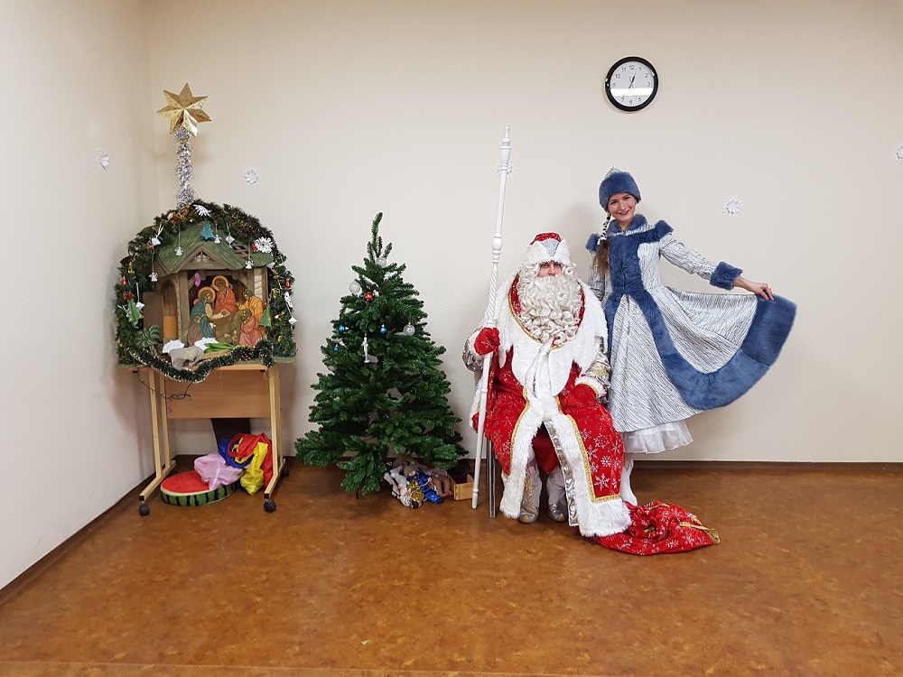 По окончанию выступления, подготовленного учениками Воскресной школы, ребятишек пришли поздравить Дед Мороз и Снегурочка. Все вместе водили хоровод, участвовали в весёлых конкурсах, танцевали и смеялись от души. И конечно же Дед Мороз пришёл не с пустыми руками, а с большим мешком подарков! А также с долгожданным зимним морозом и хрупкими снежинками за окном. Была устроена выставка рисунков учащихся нашей воскресной школы.