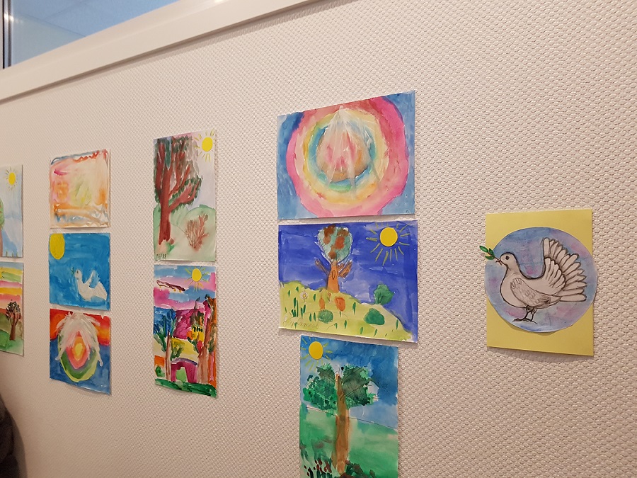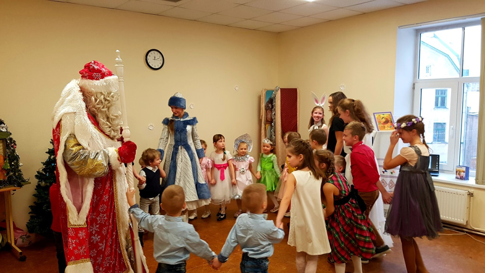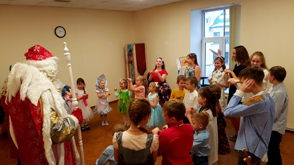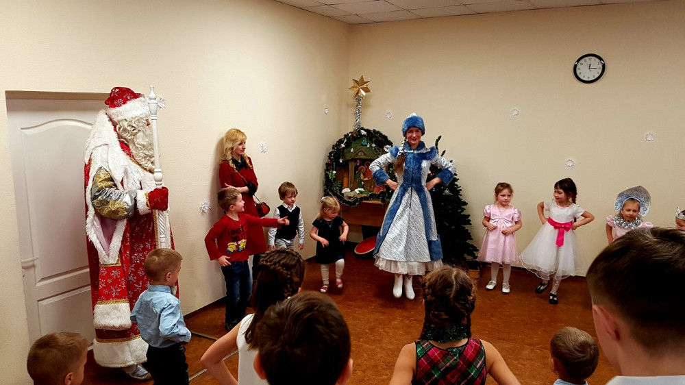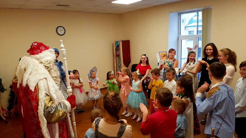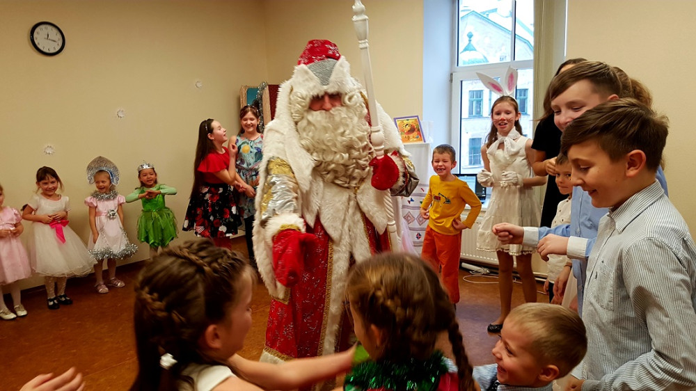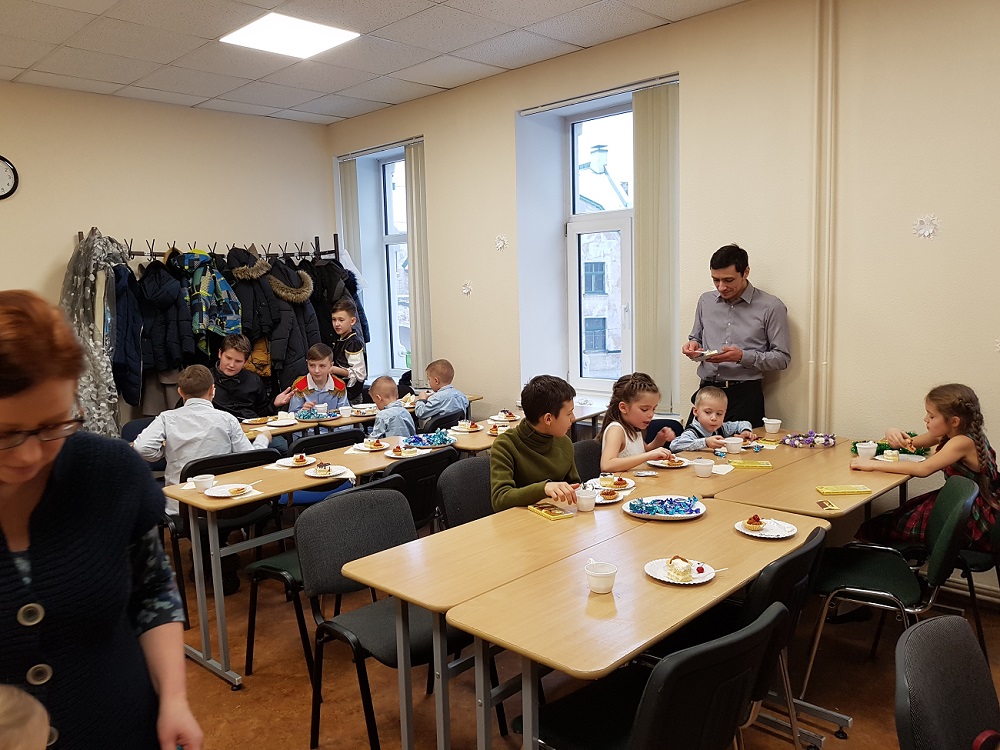 По окончанию выступления, подготовленного учениками Воскресной школы, ребятишек пришли поздравить Дед Мороз и Снегурочка. Все вместе водили хоровод, участвовали в весёлых конкурсах, танцевали и смеялись от души. И конечно же Дед Мороз пришёл не с пустыми руками, а с большим мешком подарков! А также с долгожданным зимним морозом и хрупкими снежинками за окном. Была устроена выставка рисунков учащихся нашей воскресной школы.